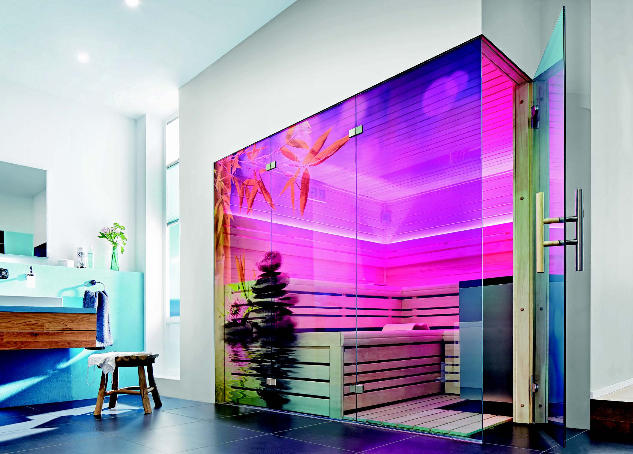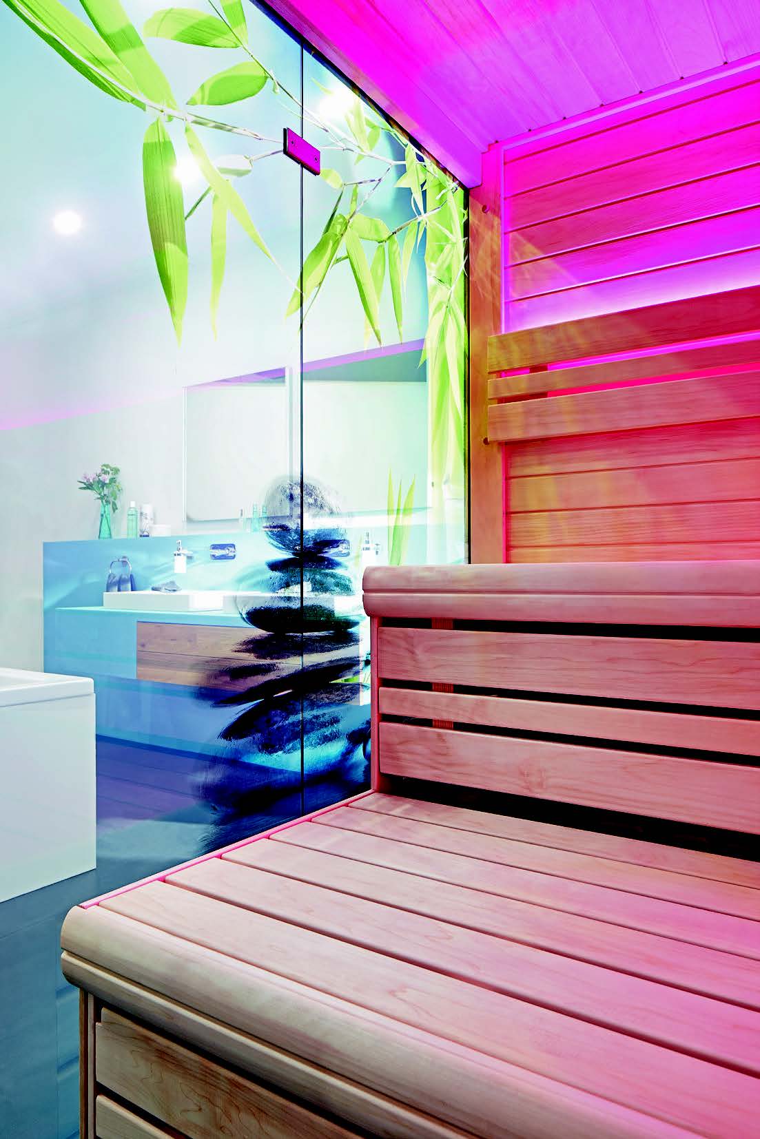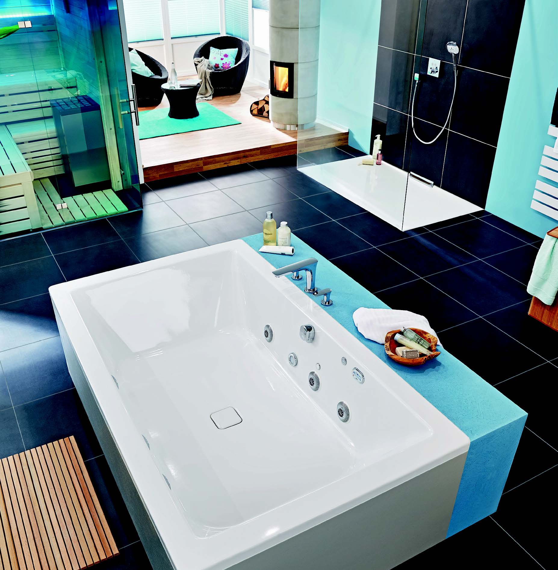 U doba kada je slobodno vrijeme dragocijeno, najčešće se provodi kod kuće koja postaje utočište od užurbane svakodnevnice pa moderan koncept stanovanja osigurava zone za opuštanje i odmor. Ovdje su opuštanje, udobnost stanovanja i wellness u prvom planu. Iz tog razloga sauna ovdje nalazi svoje mjesto u kupaonici, a ne u podrumu kao što je prije bilo uobičajeno. Isto vrijedi i za kamin koji se kod ove kupaonice u potkrovlju sasvim prirodno uklapa u cjelokupni ambijent . Osnovni ton koji dominira prostorom je azurno plava boja vidljiva na zidovima, umivaoniku, kadi i hidromasažnoj kadi. Uz dosljednu primjenu mineraliziranog mramora, prostor djeluje kao da je izliven u jednom komadu. Doživljaj kupaonice svim osjetilima Za snažni kontrast boja poslužila je sauna u izrazito crvenoj boji. Zaigrani ukrasi na staklenoj prednjoj fronti dodatno naglašavaju njen izgled. Za dobrodošao oporavak i hlađenje nakon korištenja saune poslužiti će otvoren tuš. Emajlirana površina harmonično se stapa s površinom poda kupaonice. Odvod nije smješten na podu, nego je decentno ugrađen u zid. Dva tuša fiksirana na gornjoj strani kao i pomično crijevo, korisnicima osiguravaju maksimalan komfor prilikom tuširanja. Odmah iza tuša nalazi se okrugao kamin koji funkcionira po principu „slow heat“ – 20% topline predaje se odmah, a preostalih 80% postupno. Iza mjesta za sjedenje plavi plise osigurava elegantan i funkcionalan prozorski ukras. Nedostaje li dnevnog svjetla, pale se plošni ugradbeni LED reflektori koji stvaraju umjerenu svjetlosnu atmosferu.